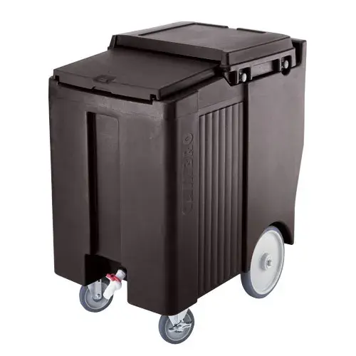 This Cambro ICS175TB-180 - 175 lb. Capacity - Tall Sliding Lid Portable Ice Bin - Grey is perfect for storing large amounts of ice over a long period of time. There is a built in drain shelf which separates water and ice to prevent the ice from melting as fast. The caddy itself is made with polyethylene plastic (extremely durable and resistant) and has thick foam insulation on the inside. The lid slides open instead of detaching which means there's no need to set it down somewhere and increase the chance of contamination. On the bottom there are four casters, two of which are swiveling and the other two are fixed with brakes.