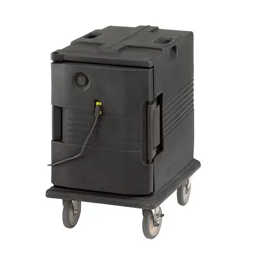 The Cambro 18" Half-Height Ultra Pan Carrier w/ Casters - H-Series [UPCHW4002-110] is a great container for holding, preserving and transporting food in food pans. The container is made with polyethylene plastic which increases its durability and heat-retention properties. The interior of the container has thick foam insulation which helps regulate heat loss incredibly well. The design of this container makes it easy to transport and easy to store. This model [UPCHW4002] has the features of the UPCHW400 model but is wired for 220 volts and plugs into European outlets.
