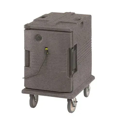 The Cambro 18" Half-Height Ultra Pan Carrier w/ Casters - H-Series [UPCHW4002-401] is a great container for holding, preserving and transporting food in food pans. The container is made with polyethylene plastic which increases its durability and heat-retention properties. The interior of the container has thick foam insulation which helps regulate heat loss incredibly well. The design of this container makes it easy to transport and easy to store. This model [UPCHW4002] has the features of the UPCHW400 model but is wired for 220 volts and plugs into European outlets.