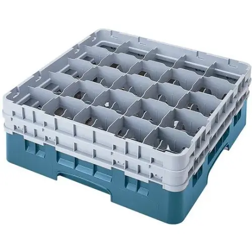 This Cambro 3.5" Stemware & Tumbler Glass Rack - Camrack [25S418-414] is a dish rack for cups with 25 compartments. Each compartment can hold a cup with a max diameter size of 3 4/9 inches and a max height of 4 1/2 inches. This square shaped cup rack fits in most commercial dish washers and makes cleaning cups and other glassware extremely easy. Thanks to the polypropylene plastic used in this construction, this cup rack is extremely durable and heat resistant. Comes in a set of 5.