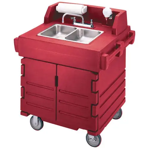 This 41" Portable Hand Sink Cart - CamKiosk [KSC402-519] from Cambro is portable add-on (or standalone) portable hand sink for Cambro's CamKiosk carts. The cart is made using polyethylene plastic which is water-resistant and durable. The cart comes with two stainless steel sinks, two 5 gallons fresh water tanks, two 7.5 gal. waste water bins, a hand soap dispenser and a paper towel roll holder. It also includes casters, two swivel with brakes and two fixed. Note: This item is not low-lead compliant and is not approved for sale in California, Louisiana, Maryland and Vermont.