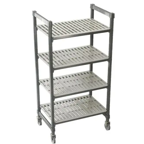 This Cambro Camshelving Mobile Shelving Unit w/ Standard Casters [CSURS48427-480] contains everything required for constructing a fully mobile shelving unit. Included are 4 posts, 8 traverses and 4 post connectors which is enough to construct an extra sturdy shelving unit. The shelves are dishwasher safe and can be removed from the unit for maintenance. Also included with this item are 2 non-corrosive swivel locking casters and 2 total locking casters for a total 4 premium locking casters.