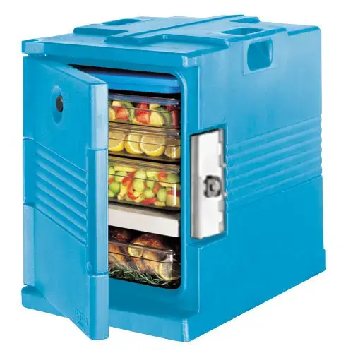 The Cambro Front Loading Food Pan Carrier w/ Security Hardware - Ultra Pan Carrier [UPC400TR-192] is a great container for holding and transporting food in food pans. The container is made with polyethylene plastic which increases its durability and heat-retention properties. The interior of the container has thick foam insulation which helps regulate heat loss incredibly well. The design of this container makes it easy to transport and easy to store.