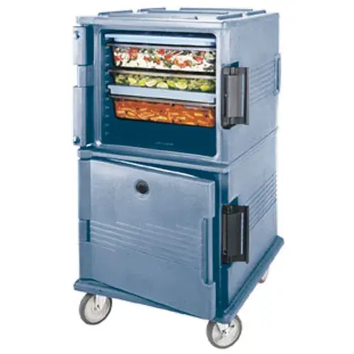 The Cambro Full Height Ultra Camcart w/ Heated Top Door - H-Series [UPCHT1600-131] is a great container for holding and transporting food and food pans. The container is made with polyethylene plastic which increases its durability and heat-retention properties. The interior of the container has thick foam insulation which helps regulate heat loss incredibly well. Additionally, the top compartment is heated to maintain its temperature longer. The design of this container makes it easy to transport and easy to store.