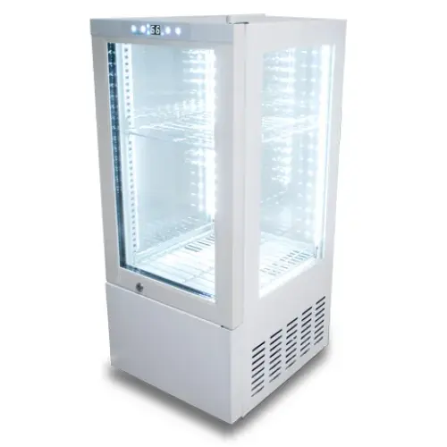 This model countertop refrigerator merchandiser has glass on all four sides for enhanced product display. The 4 view glass display allows your guests to see your items from any angle.