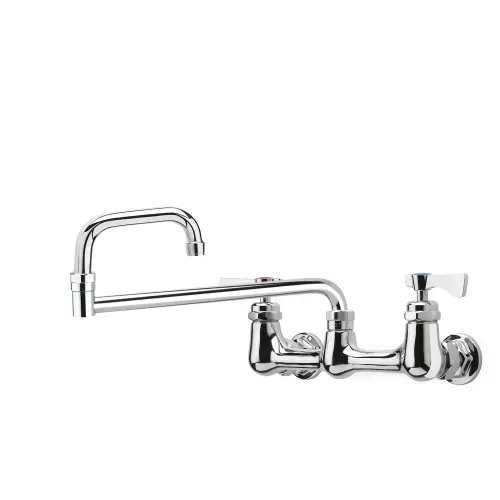 This Krowne 14-818L - Royal Series 8" Center Wall Mount Faucet - 18" Spout is simple and classic in design. It has been constructed out of high quality steel. Made using advanced welding techniques, this sink faucet is a one-piece, seamless faucet unit with with a hot and cold nob to release water. There are two nobs one on the left side of the faucet and one on the right. This sink faucet is perfect for any sink and is generally used for commercial sinks. This item will prove to be a great investment for your food service establishment.