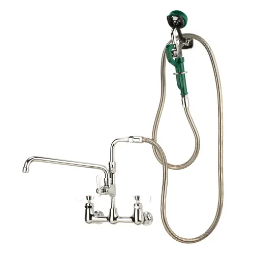 Krowne Royal Series Utility Spray with Add-On Faucet, Wall Mount, 8" Centers, 12" Spout, 96" Hose, Wall Mounting Kit, Ceramic Cartridge Valves, Low Lead Compliant. 8" centers. 12" spout. 96" hose. Ceramic cartridge valves. Wall mounting kit included. Low Lead Compliant. Elite Restaurant Equipment ensures that this product, 19112L, is easy to use and install.