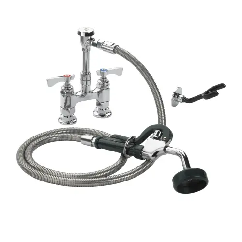 Krowne Royal Series Utility Spray Assembly, Deck-Mounted, 4" Adjustable Centers, 72" Long Galvanized Steel Flexible Hose, Plastic Coated Wall Hook, Vacuum Breaker, 1/2" NPT Male Inlets, NSF, CSA, Low Lead Compliant. 1/2" NPT male inlets on 4" adjustable centers. 72" long stainless steel flexible hose. Plastic coated wall hook with chrome plated brass base. Vacuum breaker. Low Lead Compliant. Elite Restaurant Equipment ensures that this product, 19204L, is easy to use and install.