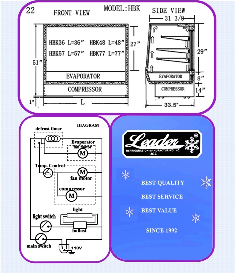 This Leader HBK36 - 36" Refrigerated Bakery Display Case - High Volume is a wonderful addition to your commercial bakery. This item includes 4 levels of display for your guests. This unit features stainless steel construction. The storage doors are designed to ease user fatigue. This unit includes internal shelves which can hold and display great quantity of your products. This refrigerator holds 38-40°F for the best in bakery preservation.