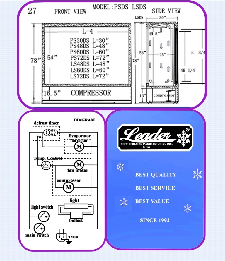 Leader LS72DS - 72" Sliding Glass Door Refrigerator - Four View |
