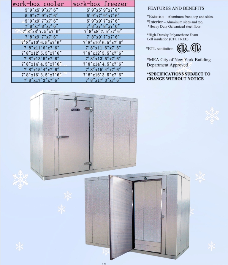 This Leader WIC178SC - 17' x 8' Walk In Cooler - Self Contained has your interior cooler needs covered. The frame is 17' x 8'. It is built of aluminum and heavy duty stainless steel panels. The standard height is 7' 6". It is insulated by high density polyurethane foam (CFC Free). It meets ETL Sanitation guidelines as well. These units are fully customizable if necessary.
