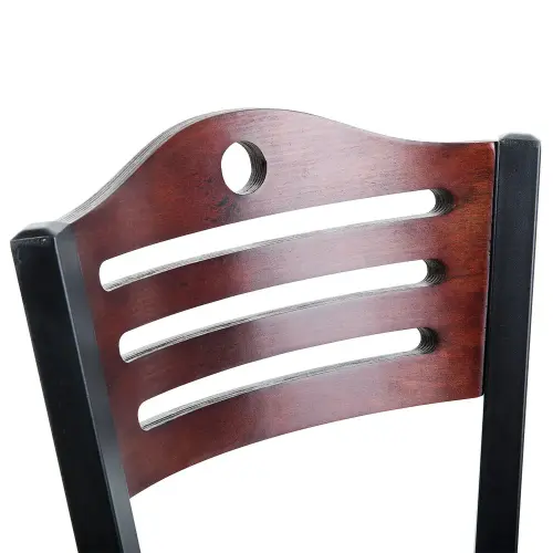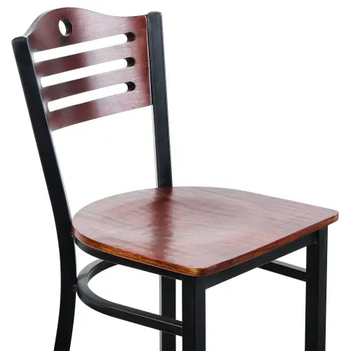 Accent the comfortable, yet classy feel of your restaurant, cafe, or sports bar with this contemporary mahogany colored bistro style bar height chair from Lancaster Table & Seating. The heavy duty bar height Bistro chair's seat and eagle back style backrest are made of wood, which is laminated and formed for added comfort and support. A high-carbon frame made of durable, 1 1/4" steel tubing and reinforced, welded joints give the Bistro bar height chair exceptional stability. The frame's baked-on, polyurethane powder coat finish is resistant to stains, scratches, and smudges. The bar height Bistro chair also comes with plastic glides to protect your floors from scuffing.