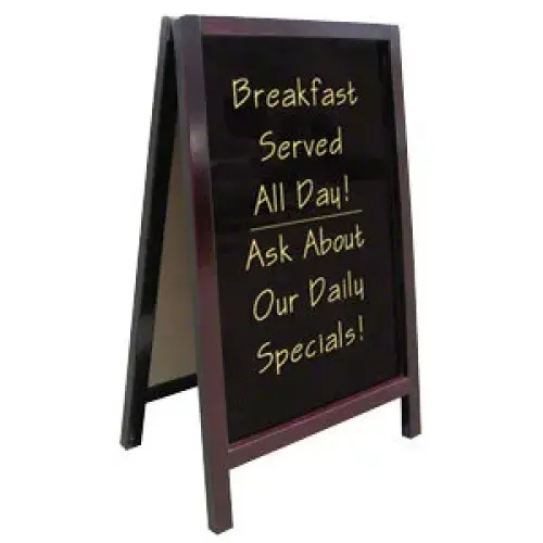 Display your important announcements for all to see with this eye-catching wet erase write-on A-frame sidewalk sign! The write-on sidewalk sign's sophisticated dark brown wood frame and black writing surface provide the perfect backdrop to highlight dinner specials, featured drinks and desserts, or even upcoming events at your restaurant, bar, or cafe. The A-frame style write-on sidewalk sign sits on sturdy 4" legs and comes with one white, blue, green, and red wet erase chalk marker. See Companion Items for additional wet erase marker packs.