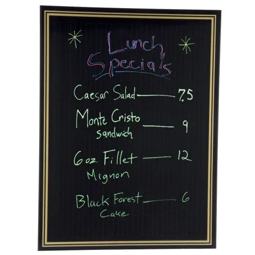 Appears to be illuminated, although no electricity is required and your sign can be placed anywhere. Ideal for daily specials and menus. Available with an ebony frame. This write-on sign board does not come with markers. This board can also be used with dry erase markers.