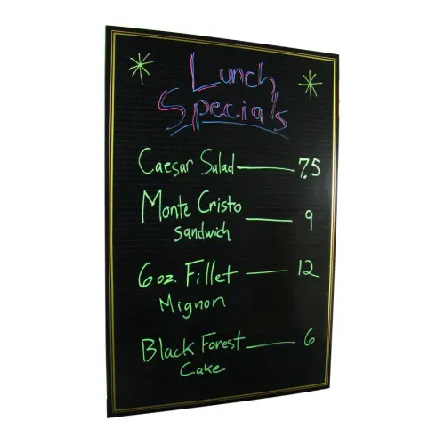 Make your messages "stand out" in a crowd with this 24" x 36" ebony write on board. Its special black write on surface gives your messages the appearance of back lighting, without electricity! The write on board's ebony frame blends with the writing surface, drawing attention to your daily specials, sales, or menu offerings. This 24" x 36" ebony write-on sign board does not come with markers. Not all wet erase markers are compatible. The 5-pack linked under Companion Items has been tested to be compatible. This board can also be used with dry erase markers.