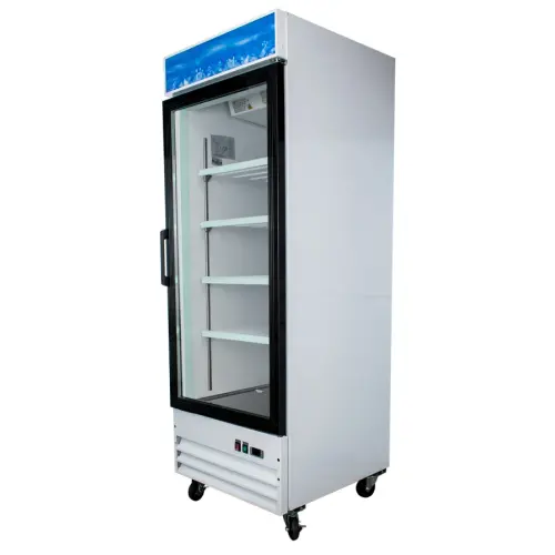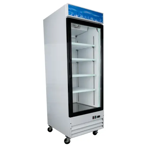 The one door glass reach in refrigerator is designed to display merchandise and provide refrigerated storage.