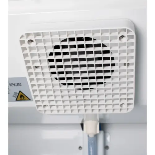 This glass swinging merchandiser includes a top mounted cooling fan, which enables proper, even air distribution. The fan works in conjunction with the foamed polyurethane insulation to maintain cool, even temperatures throughout the unit.