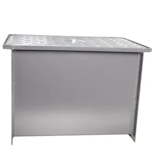 The 8 LB. 4 GPM grease trap Interceptor connects to the kitchen sink. This item can be installed on the floor, partially in the floor or fully recessed. One piece baffle assembly. Cover is removable for easy cleaning.