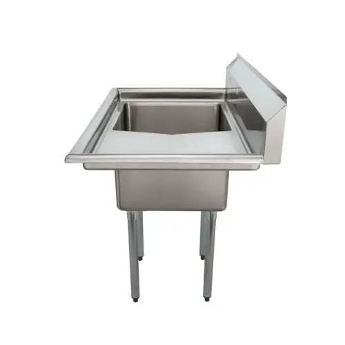 This commercial sink with one compartment includes a 18 inch x 18 inch drainboard on the right side. The drainboard is often used to place clean or ready to be cleaned dishware.