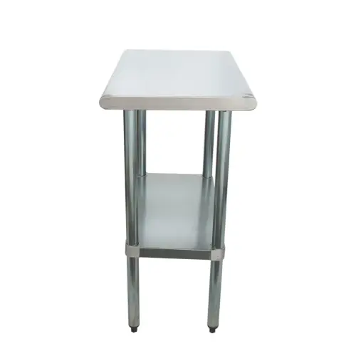 This commercial work table is a bull nose design in the front and back and a flat lip design on both sides which meets at 90° degrees. The edges are welded and grounded smooth, keeping your workplace safe.