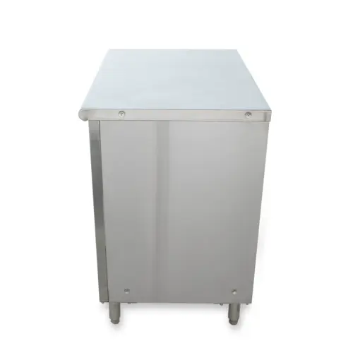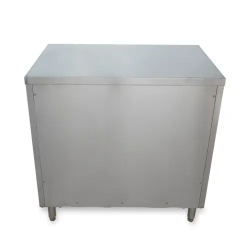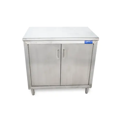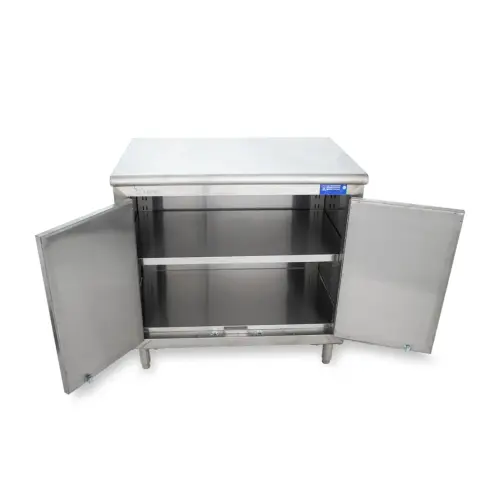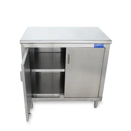 This Universal ST-324-36-S - 24" X 36" Stainless Steel Storage Cabinet - Swinging Doors - comes with the option of sliding/swinging doors, or no doors at all. This storage cabinet is ideal for dishes, glasses, detergents and anything else you might wish to put in there. This item can be used as a work top table because of its 36" height. It saves space in any kitchen and cleans easy because of the stainless steel. Comes with 1 shelf for 2 levels of storage.