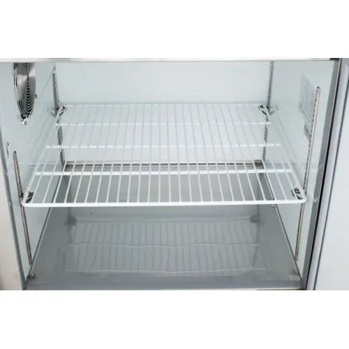 The refrigerated base of this pizza prep table is great for storing overstock ingredients. This pizza prep table includes wire shelving. The base is located below the work area and is easily accessed by opening the doors. This model is programmed to keep temperatures below 41 degrees farenheight. The refrigerated features an automatic defrost system which turns the compressor on when it gets too warm and turns the compressor off when it is too cool.