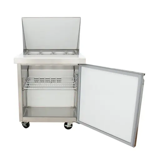 The Universal USPT28 28” mega top one door sandwich and salad prep table refrigerator provides plenty of room to assemble your culinary production. This 28” one door sandwich prep table is ideal for foodservice establishments. The mega top design holds more food pans than regular models. Generally users store vegetables, cheeses, meats, and other condiments in the food pans. This 28” one door sandwich prep table includes a cutting board, you’ll have plenty of room to assemble sandwiches, wraps, and salads. The 4 built in casters makes the prep table easy to clean underneath the refrigerated prep table.