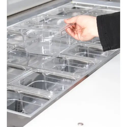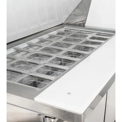 This model sandwich and salad prep table features and insulated, hinged lid which keeps in cold air during off hours. With an insulated lid you can keep toppings fresh overnight.