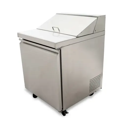 The 28" one door sandwich salad prep table has extra cutting board area to prepare sandwiches and salads.