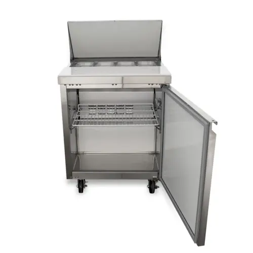 The Universal USPTR28 28” sandwich and salad prep table refrigerator provides plenty of room to assemble your culinary production. This 28” one door sandwich / salad prep table is ideal for foodservice establishments. The top design holds food pans. Generally users store vegetables, cheeses, meats, and other condiments in the food pans. This 28” one door sandwich / salad prep table includes a cutting board, you’ll have plenty of room to assemble sandwiches, wraps, and salads. The 4 built in casters makes the prep table easy to clean underneath the refrigerated prep table.