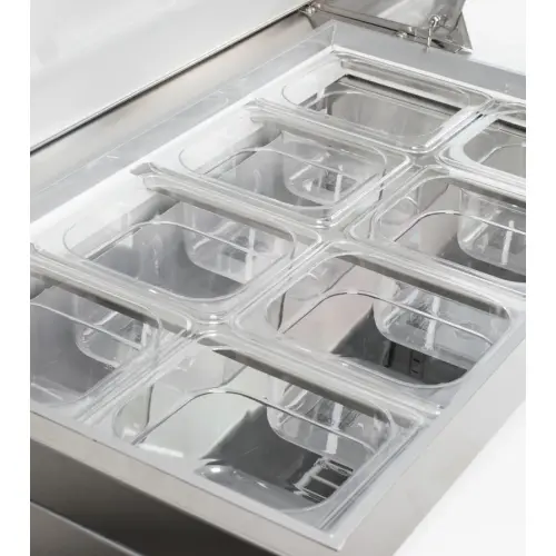 This model sandwich and salad prep table features and insulated, hinged lid which keeps in cold air during off hours. With an insulated lid you can keep toppings fresh overnight.
