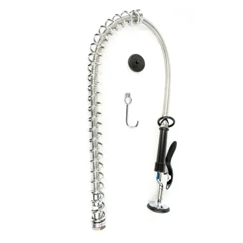 This wall mounted pre rinse faucet with sprayer includes a 44" hose with a 14" overhang and flow rate of 1.5 GPM. The flexible hose ensures safety while easily spraying across multiple sink bowls. This flexible hose allows you to comfortable rinse your dishes at any angle.