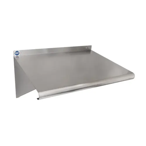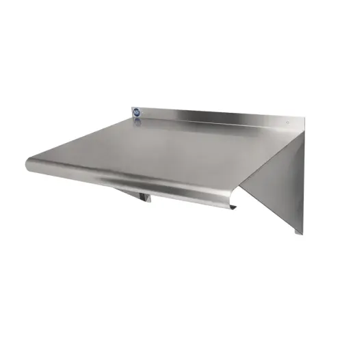This commercial wall shelf includes 18-gauge 430 stainless steel construction with #4 finish. The matte finish eliminates glossy sheen.