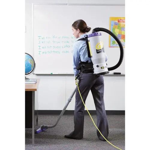 Easily clean all throughout your establishment using the ProTeam 107113 6 qt. Super QuarterVac HEPA backpack vacuum cleaner with Xover performance floor tool kit! This easy-to-transport unit weighs 10 lbs. and makes it easy to clean around and under tables, chairs, and other furniture. Its HEPA filtration feature works with ProTeam’s four level filtration system to capture up to 99.97% of airborne particles 0.3 microns or larger, ensuring you have the cleanest environment possible. This vacuum is ergonomically designed to distribute weight across the hips for comfort, and a thermal protector shut-off switch prevents the motor from overheating. It comes with a 1 1/2" diameter static-dissipating hose, 50 foot extension cord, and two Intercept Micro filters. It boasts a high-powered motor that removes more soil from carpet up to three times faster than traditional upright vacuums. Plus, an integrated tool belt keeps accessories within easy reach for maximum ease! The ProTeam 107113 Super QuarterVac HEPA requires a 120V electrical connection for operation and is CRI certified. Please consult the Specification Sheet for additional details. Xover performance tool kit C includes: - 14" Xover performance floor tool - 42" to 59" aluminum telescoping wand - 17" crevice tool - 3" dust brush with reducer - 5"upholstery tool