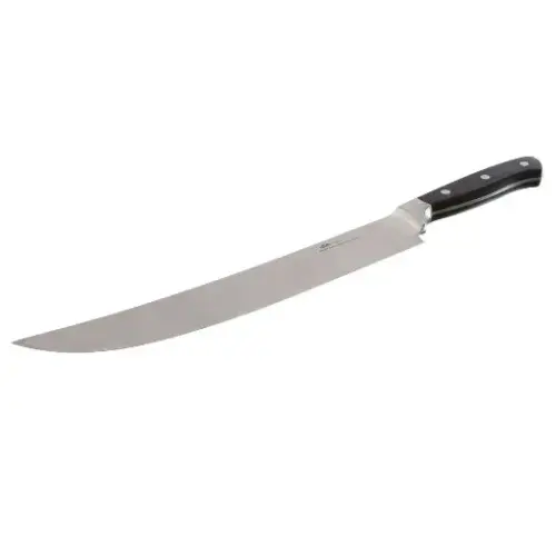 The Update International KGE-10 - Stainless Steel - Forged Cimeter Knife - 1" x 2.13" x 16" is an important item to keep in every restaurant establishment that needs to cut large pieces of meat. This Forged Cimeter Knife is made of high-carbon stainless steel with molybdenum vanadium. The handle of the knife is made from durable, slip-resistant POM and has a contoured shape to better fit your hand. Hand-honed knife has pointed blade tip with straight edge. Measures 16-2/5-inch overall length 11-inch blade length.